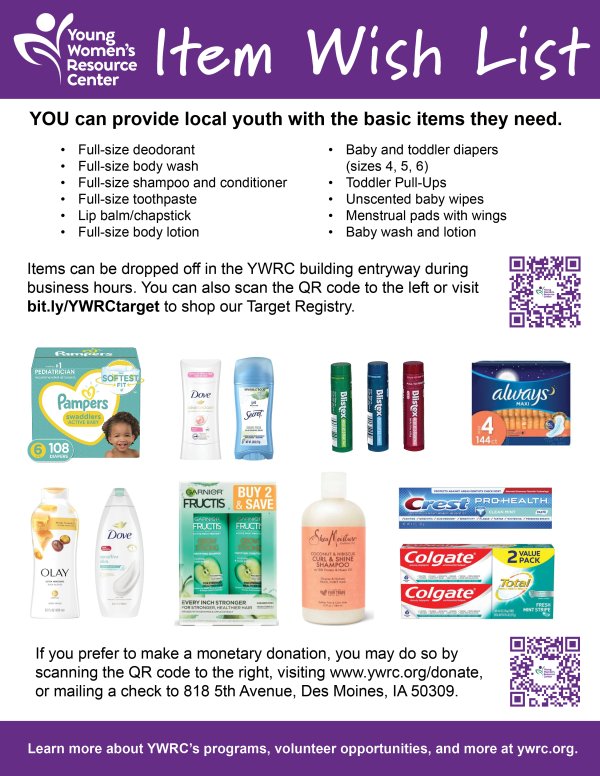 If you’re interested in hosting a donation drive contact Feleecia, Community Outreach Manager, at (515) 244-4901 or at fwatkins@ywrc.org for more information.