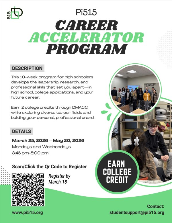 Pi515's Career Accelerator Program is a 9-week program for high school students designed to explore diverse career fields, engage with industry speakers, and build digital literacy and interpersonal skills. The "Upskill Yourself" curriculum develops essential career readiness skills, and students who complete the program have the opportunity to earn 2 free DMACC credits. Participants will create a professional resumé, write a cover letter, and practice effective interview strategies through mock interviews and guided feedback.
